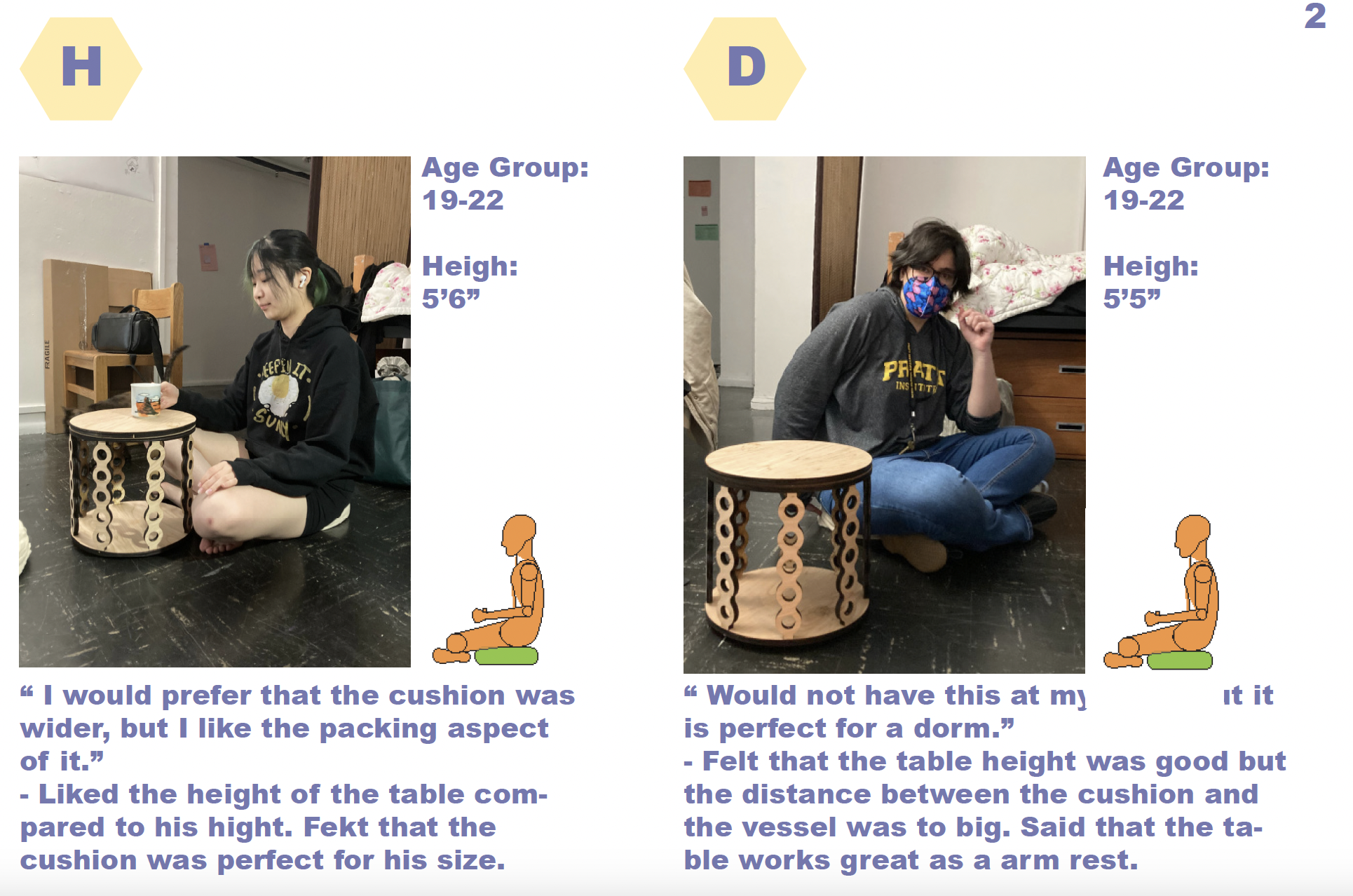 The model was made from cardboard, muslin, and thin upholstery foam. It was taken to people’s homes as to simulate the “homey” social environment. Users of different ages and sizes were free to interact with the features and share their feedback. Return to Camomila Process